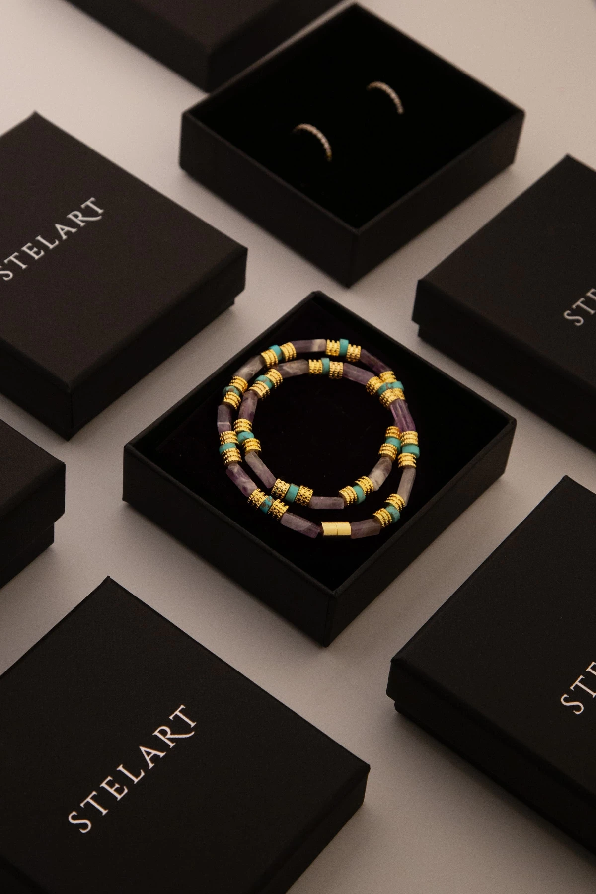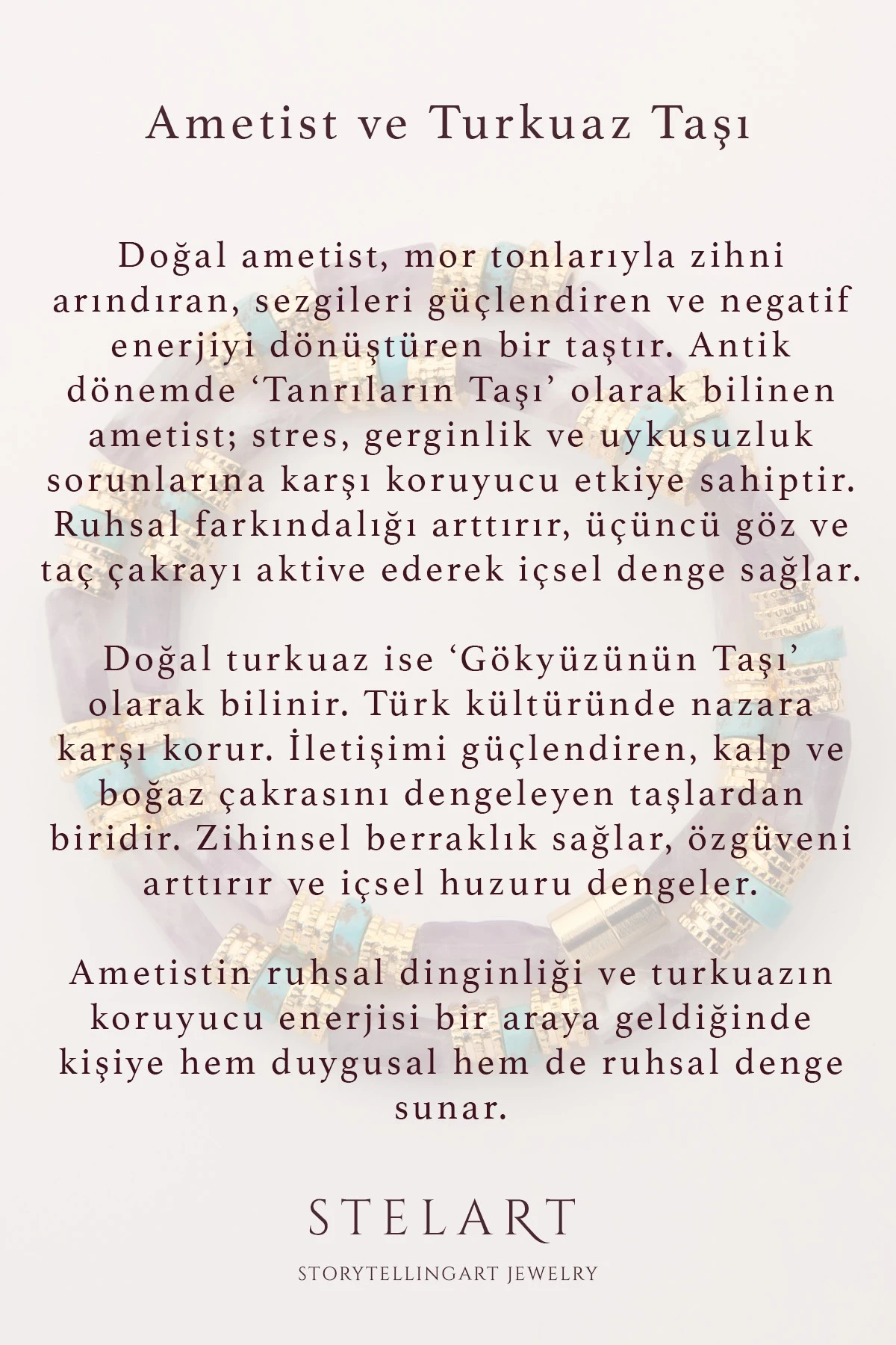 Ametist ve turkuaz taşı dinginlik ve içsel gücün buluştuğu denge noktasıdır. Ruhun derinliklerine dokunan iki farklı frekansın uyumlu birleşimini temsil eder. Doğal ametist taşı, mor tonlarıyla zihni arındırır, sezgiyi güçlendirir ve negatif enerjileri dönüştüren bir taştır. Antik dönemlerde 'Tanrıların Taşı' olarak bilinen ametist, özellikle stres, gerginlik ve uykusuzluk sorunlarına karşı koruyucu etkiye sahiptir. Ruhsal farkındalığı arttırır, üçüncü göz ve taç çakrayı aktive ederek içsel denge sağlar. Balık, Kova, Yay ve Başak burcunun taşıdır. Doğal Turkuaz ise 'Gökyüzünün Taşı' olarak bilinir. Türk kültüründe nazardan korur, iletişimi güçlendirir, kalp ve boğaz çakrasını dengeler. Yay, Oğlak ve Boğa burcunun taşıdır.