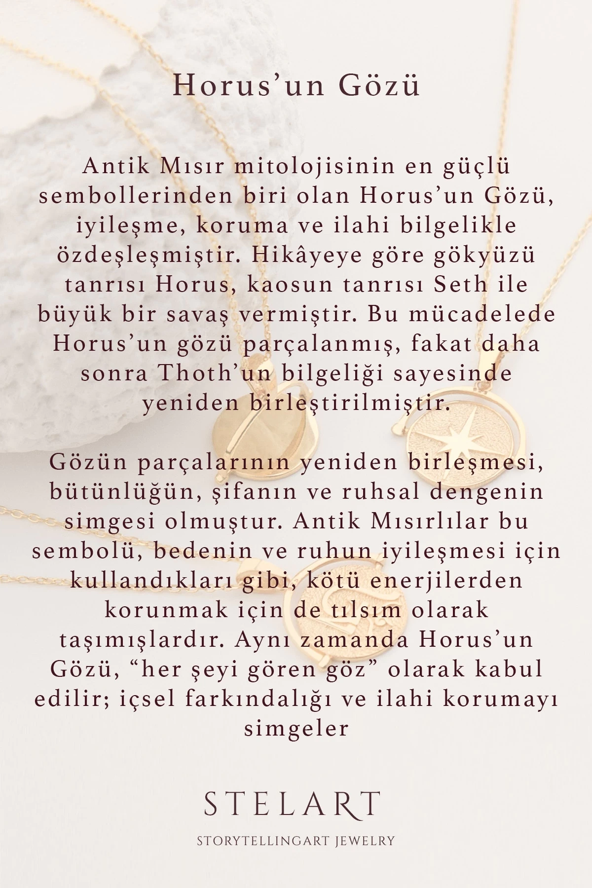 Antik Mısır mitolojisinin en güçlü sembollerinden biri olan Horus’un Gözü, iyileşme, koruma ve ilahi bilgelikle özdeşleşmiştir. Hikâyeye göre gökyüzü tanrısı Horus, kaosun tanrısı Seth ile büyük bir savaş vermiştir. Bu mücadelede Horus’un gözü parçalanmış, fakat daha sonra Thoth’un bilgeliği sayesinde yeniden birleştirilmiştir. Gözün parçalarının yeniden birleşmesi, bütünlüğün, şifanın ve ruhsal dengenin simgesi olmuştur. Antik Mısırlılar bu sembolü, bedenin ve ruhun iyileşmesi için kullandıkları gibi, kötü enerjilerden korunmak için de tılsım olarak taşımışlardır. Aynı zamanda Horus’un Gözü, “her şeyi gören göz” olarak kabul edilir; içsel farkındalığı ve ilahi korumayı simgeler