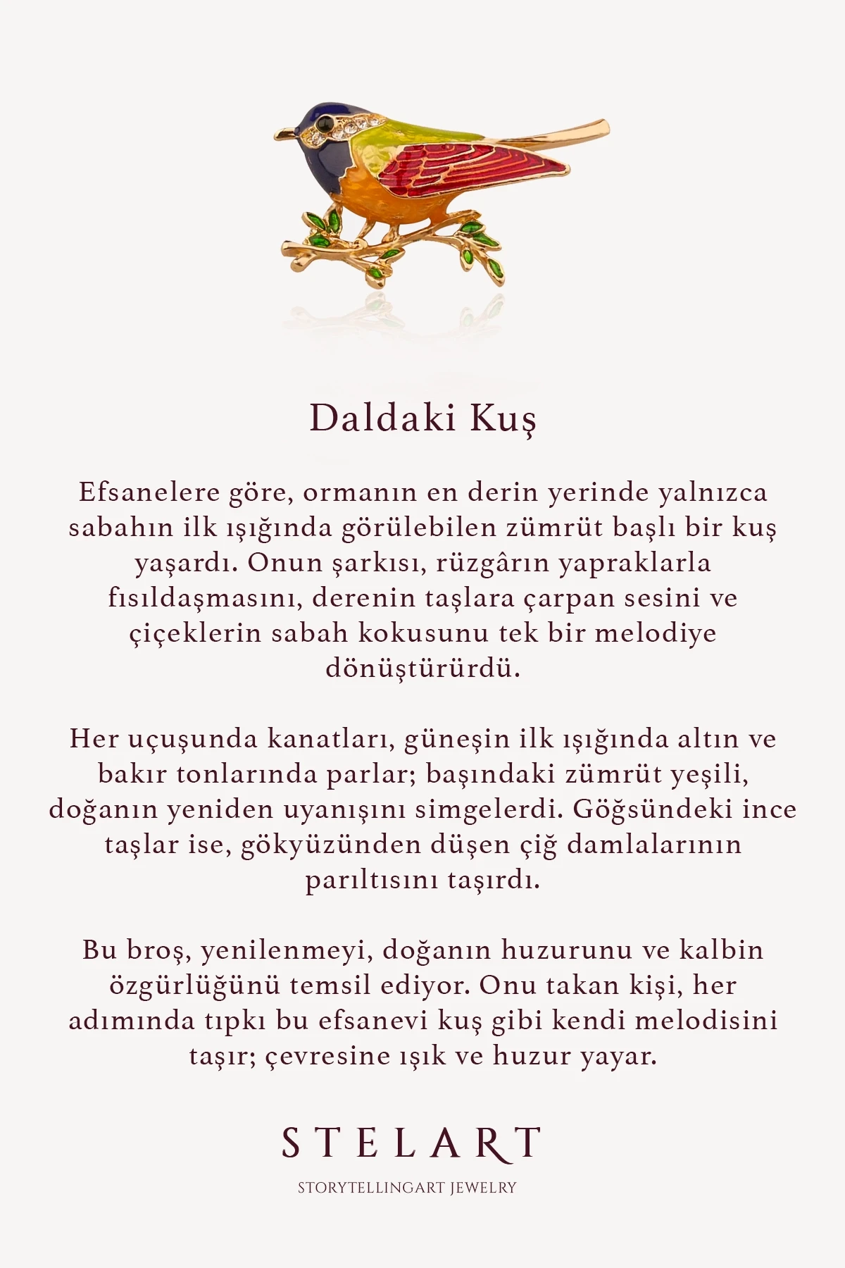 Doğanın en özgür ruhu olan kuşlar, umut ve yeni başlangıçların sembolüdür. Bu zarif kuş broş, yeşilin huzurunu ve morun asaletiyle birleşen kanatlarıyla özgürlüğün ve zarafetin hikayesini taşır. Üzerindeki parlak zirkon taşlar, her ışıkta parlayarak bakışları üzerinize çeker. Sade bir kombini canlandırmak veya özel bir davette şıklığınızı tamamlamak için tasarlandı. Broşun her detayında doğanın ilhamını ve ince işçiliğini hissedeceksiniz.