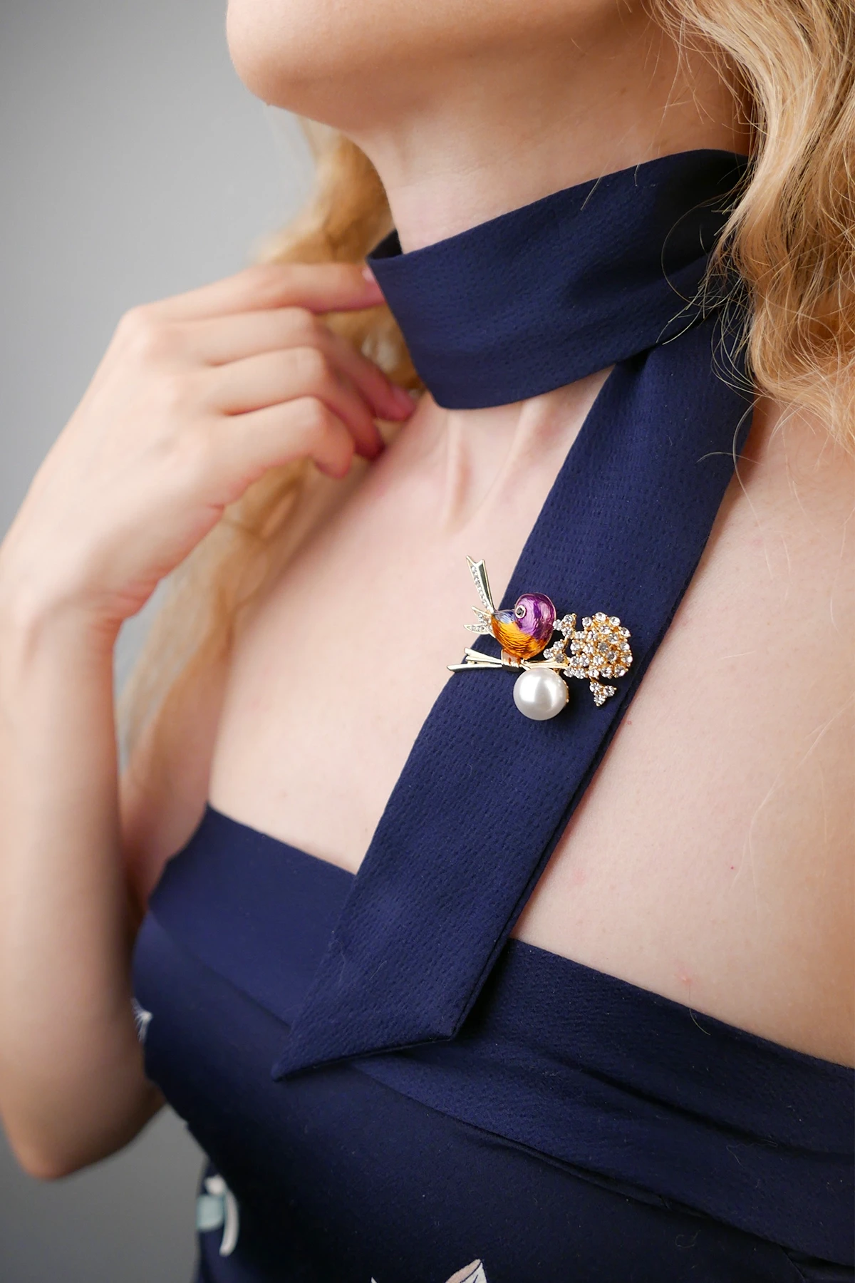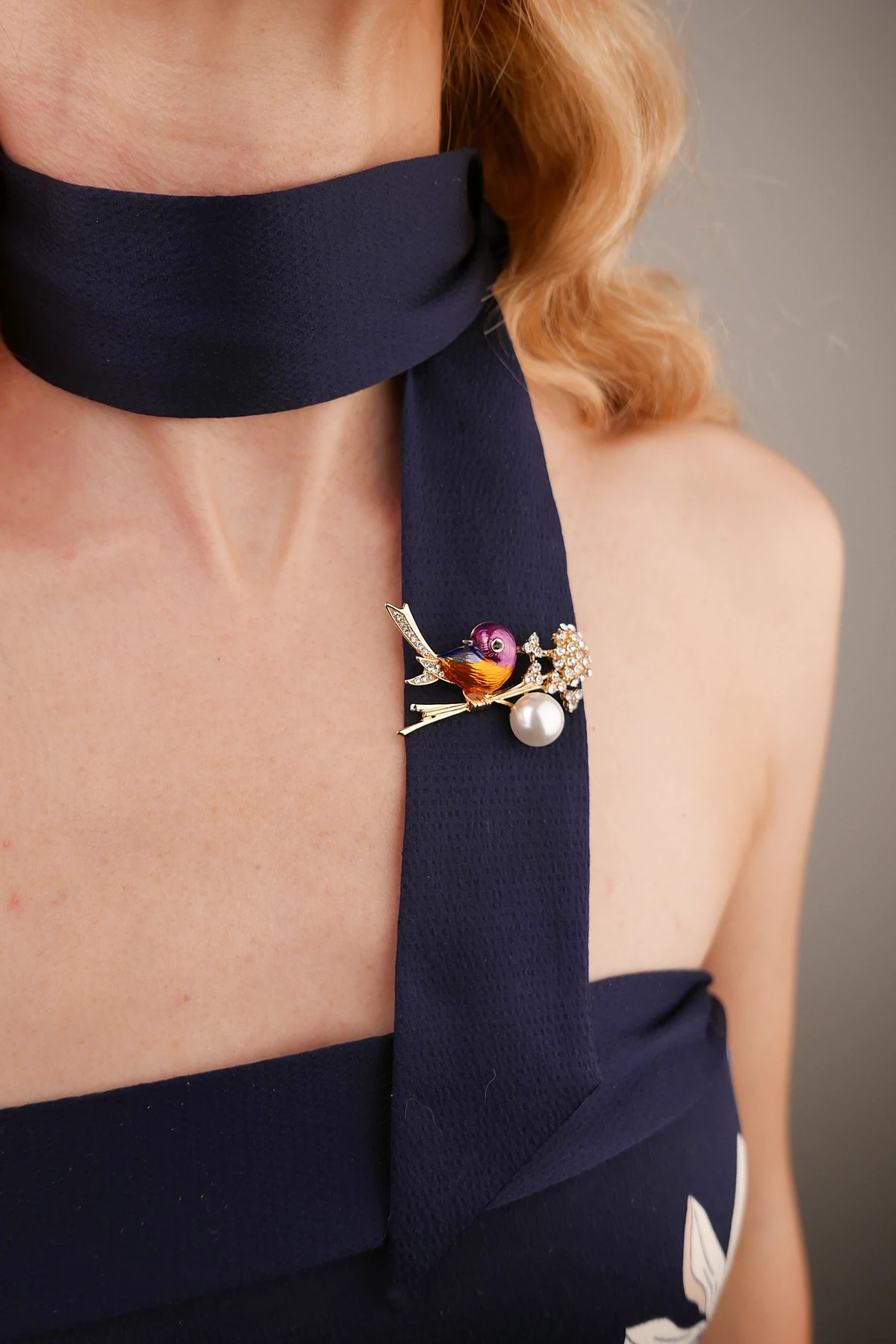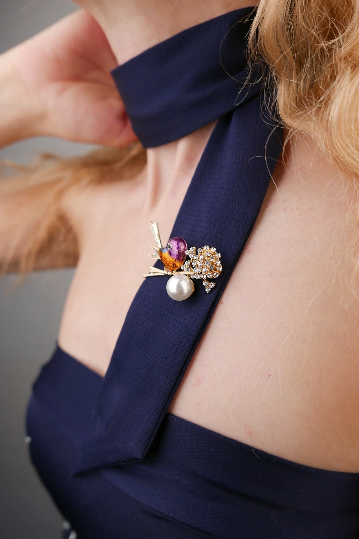 Mor, turuncu ve altın tonlarında tasarlanmış incili ve zirkon taşlı kuş broş, stilinize şık bir dokunuş katmak için ideal bir aksesuardır. Ceket yakasına, çantanıza veya şapkanızda kullanarak kombininizi tamamlayabilirsiniz.