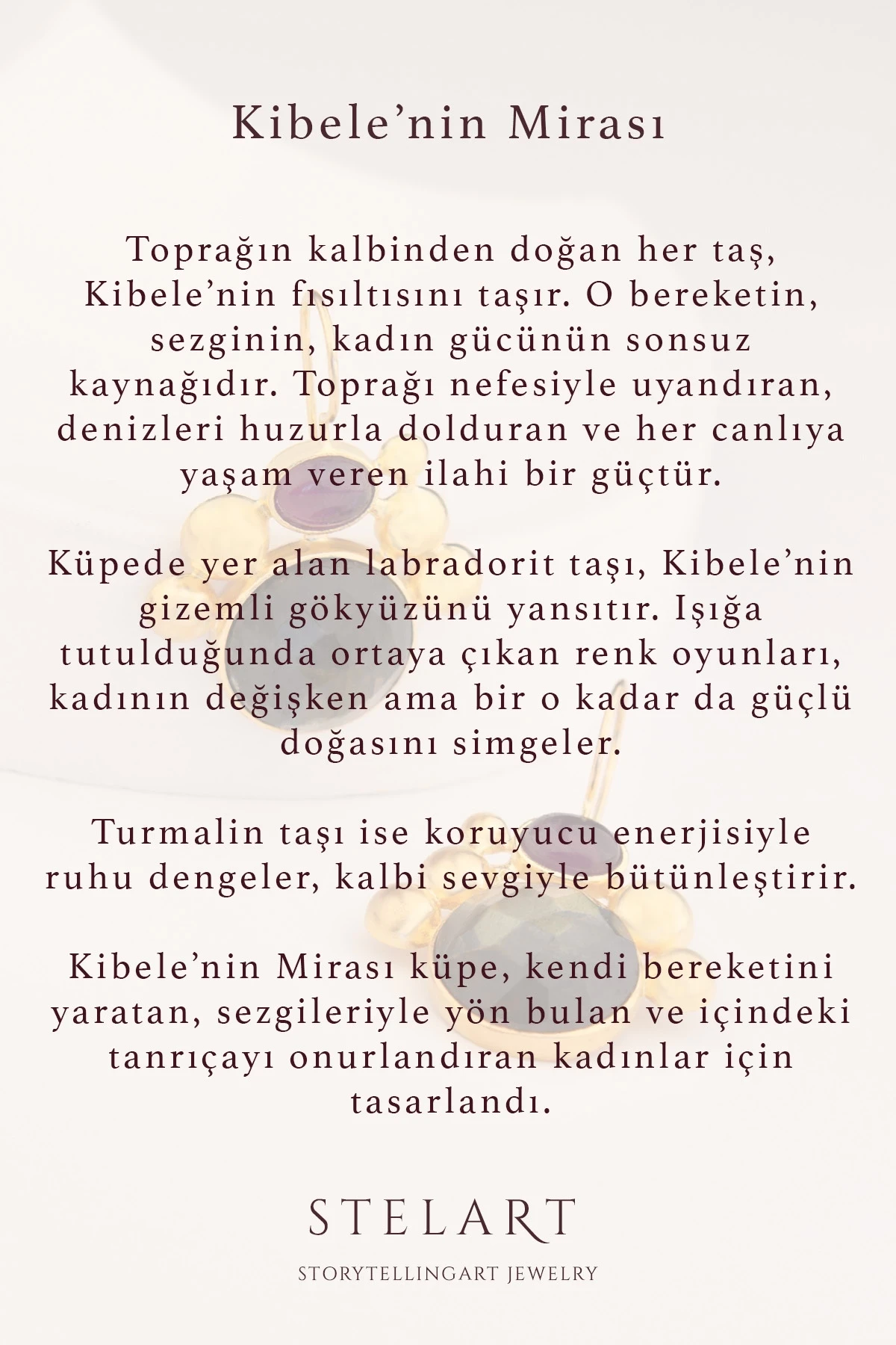Toprağın kalbinden doğan her taş, Kibele'nin fısıltısını taşır. O bereketin, sezginin, kadın gücünün sonsuz kaynağıdır. Toprağı nefesiyle uyandıran, denizleri huzurla dolduran ve her canlıya yaşam veren ilahi bir güçtür. Küpede yer alan labradorit taşı; Kibele'nin gizemli gözyüzünü yansıtır. Işığa tutulduğunda ortaya çıkan renk oyunları, kadının değişken ama bir o kadar da güçlü doğasını simgeler. Turmalin taşı ise koruyucu enerjisiyle ruhu dengeler, kalbi sevgiyle bütünleştirir. Kibele'nin Mirası küpe, kendi bereketini yaratan, sezgileriyle yön bulan ve içindeki tanrıçayı onurlandıran kadınlar için tasarlandı.