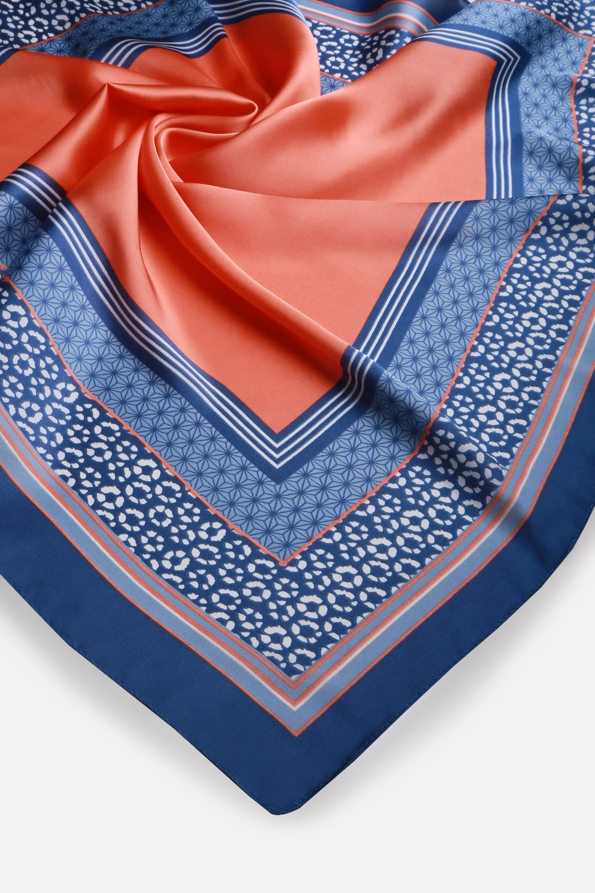 İpeksi dokulu saten kumaştan üretilen çiçek desenli fular; lacivert ve turuncu tonların zarafetiyle hem günlük kombinlere hem de özel davet stillerine sofistike bir dokunuş katar. Yumuşak parlaklığı ve akıcı formu sayesinde boyun, çanta, saç ya da bilek aksesuarı olarak çok amaçlı kullanılabilir. Özel kutulu sunumu ile kurumsal hediyelik, özel gün hediyesi arayanlar için mükemmel bir tercihtir.
