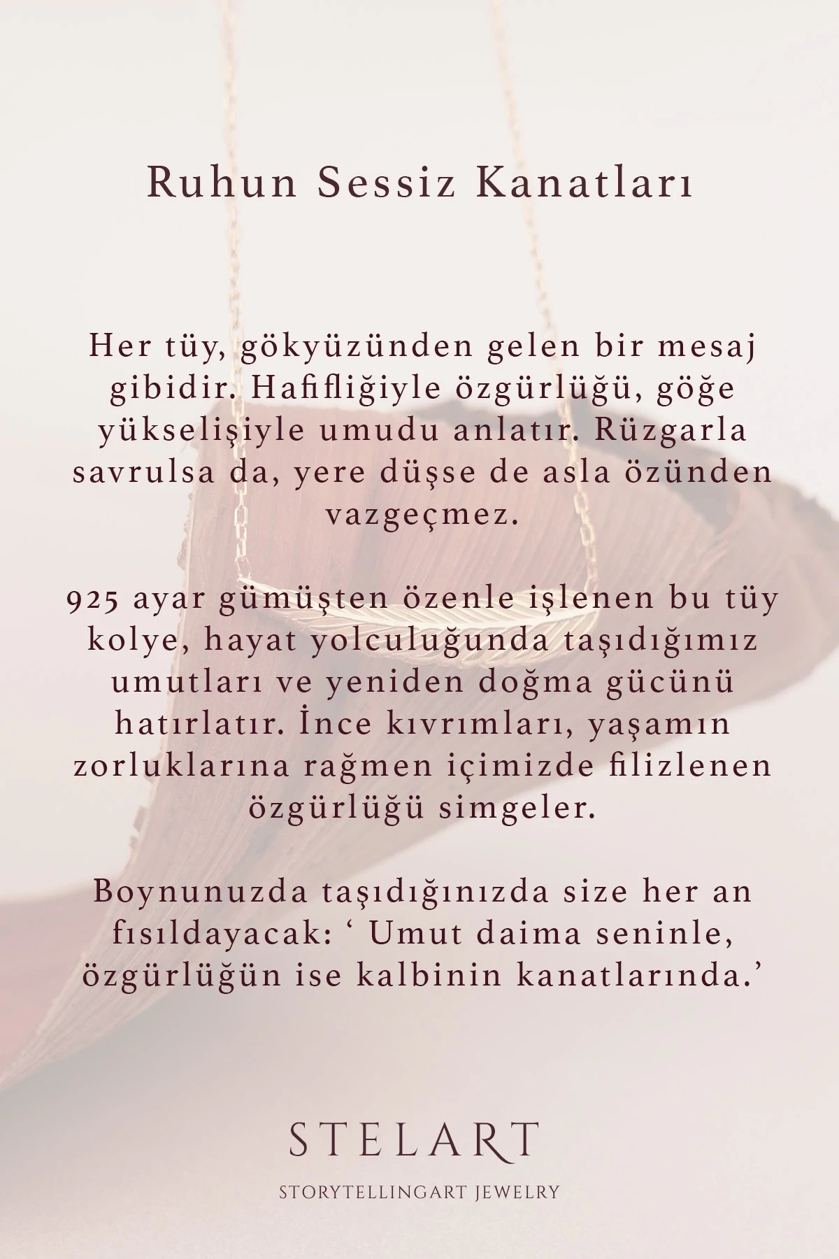 Her tüy, gökyüzünden gelen bir mesaj gibidir. Hafifliğiyle özgürlüğü, göğe yükselişiyle umudu anlatır. Rüzgarla savrulsa da, yere düşse de asla özünden vazgeçmez. 925 ayar gümüşten özenle işlenen bu tüy kolye, hayat yolculuğunda taşıdığımız umutları ve yeniden doğma gücünü hatırlatır. İnce kıvrımları, yaşamın zorluklarına rağmen içimizde filizlenen özgürlüğü simgeler. Boynunuzda taşıdığınızda size her an fısıldayacak: ‘ Umut daima seninle, özgürlüğün ise kalbinin kanatlarında.’